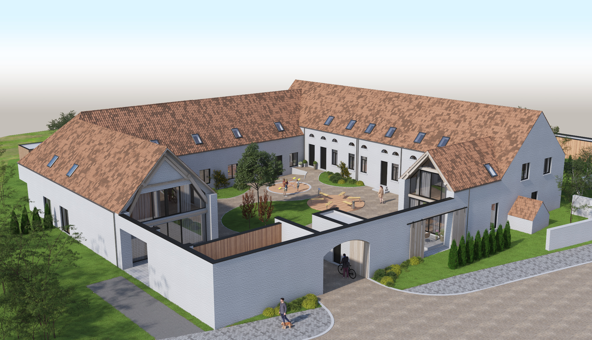 Het nieuwe woonerf omvat 10 eengezinswoningen omheen een gemeenschappelijke binnentuin met een gemeenschappelijke groenzone achteraan ( 3000m² ) , de nodige parkeerplaatsen en tuinbergingen. De woningen worden volledig afzonderlijk van elkaar gebouwd en met elk een eigen privé-tuin. Iedere woning heeft 3 of 4 slaapkamers.
